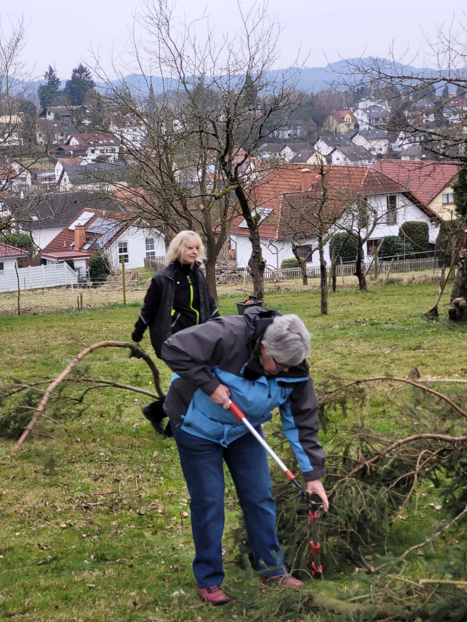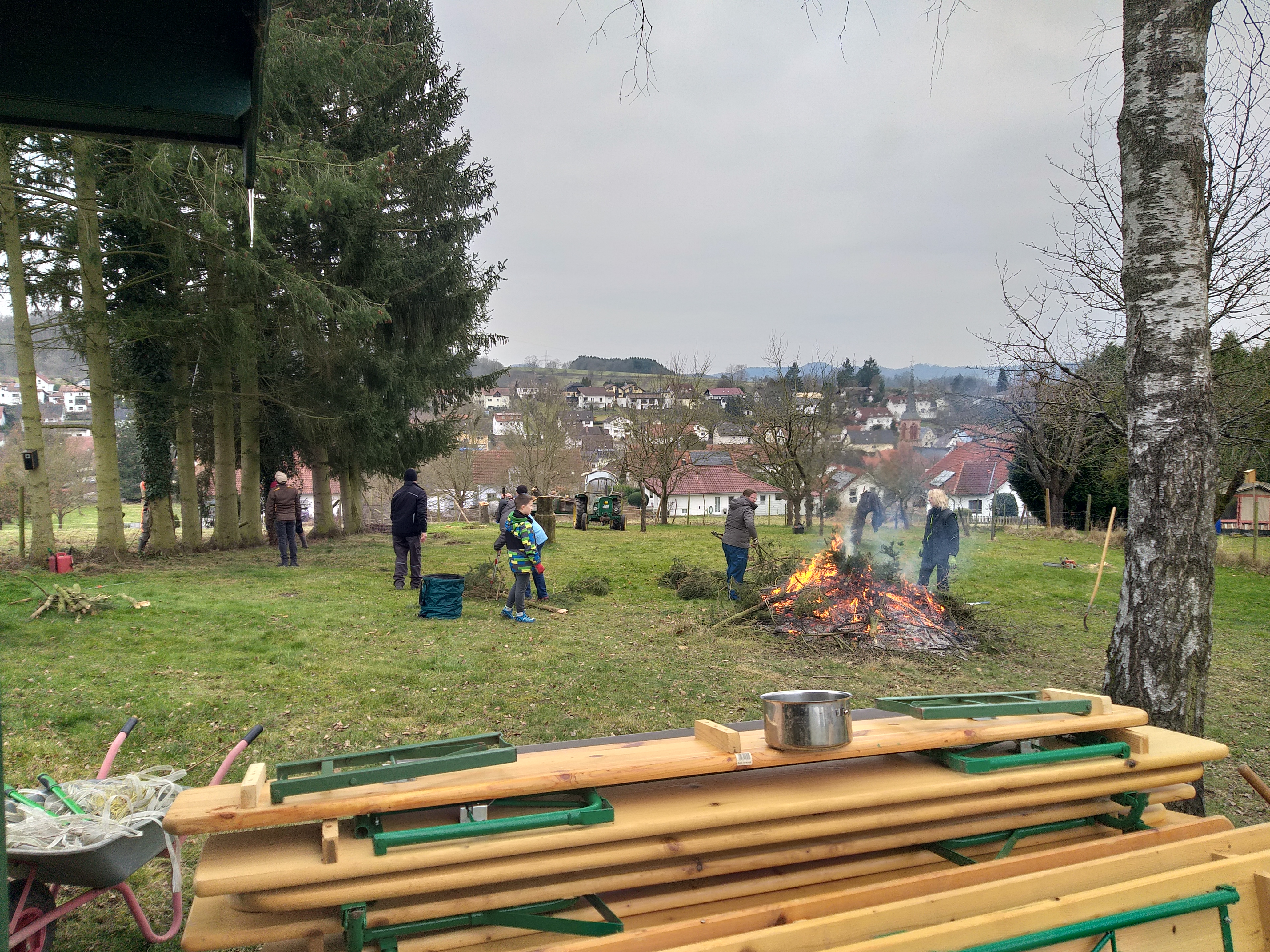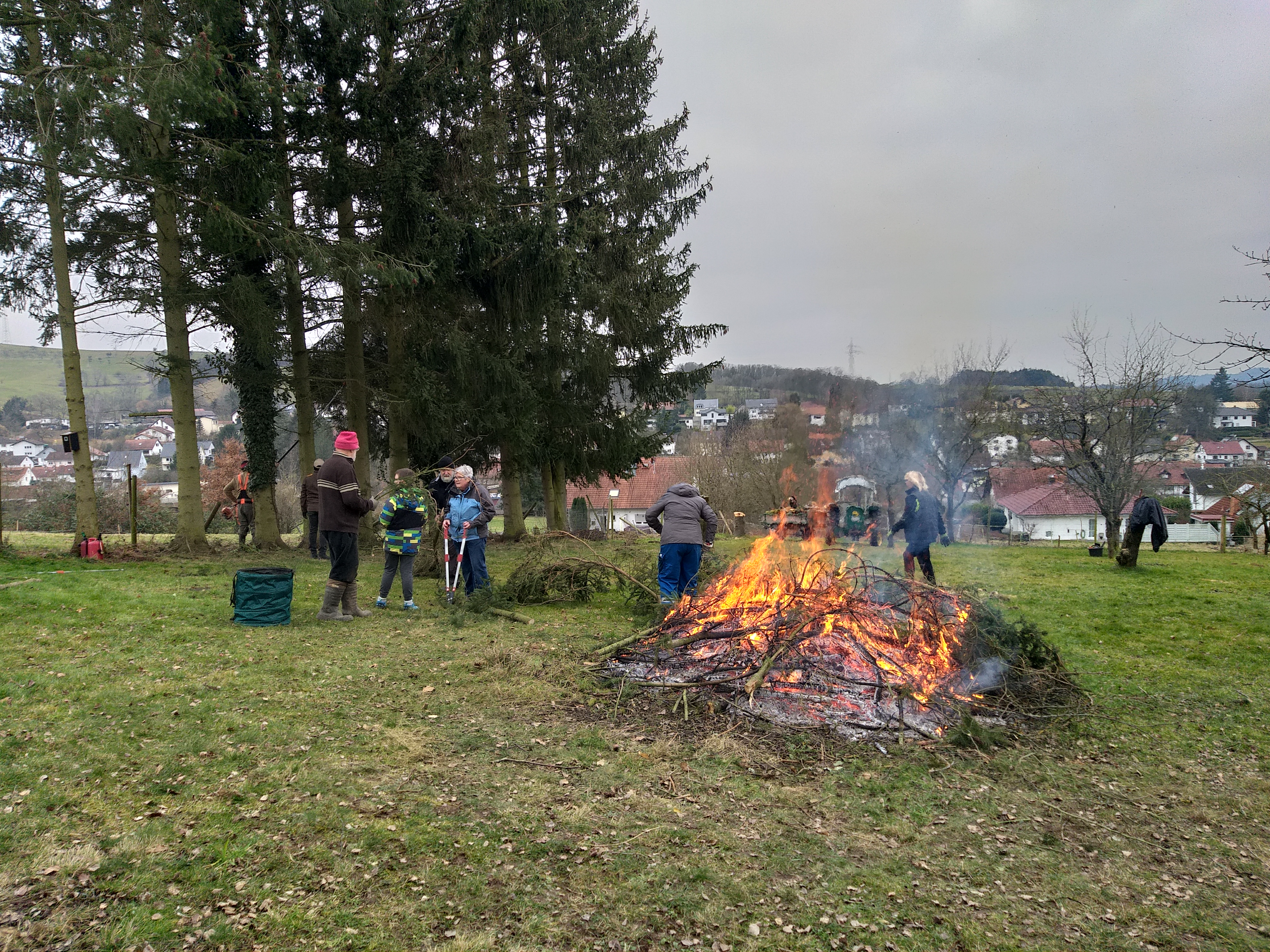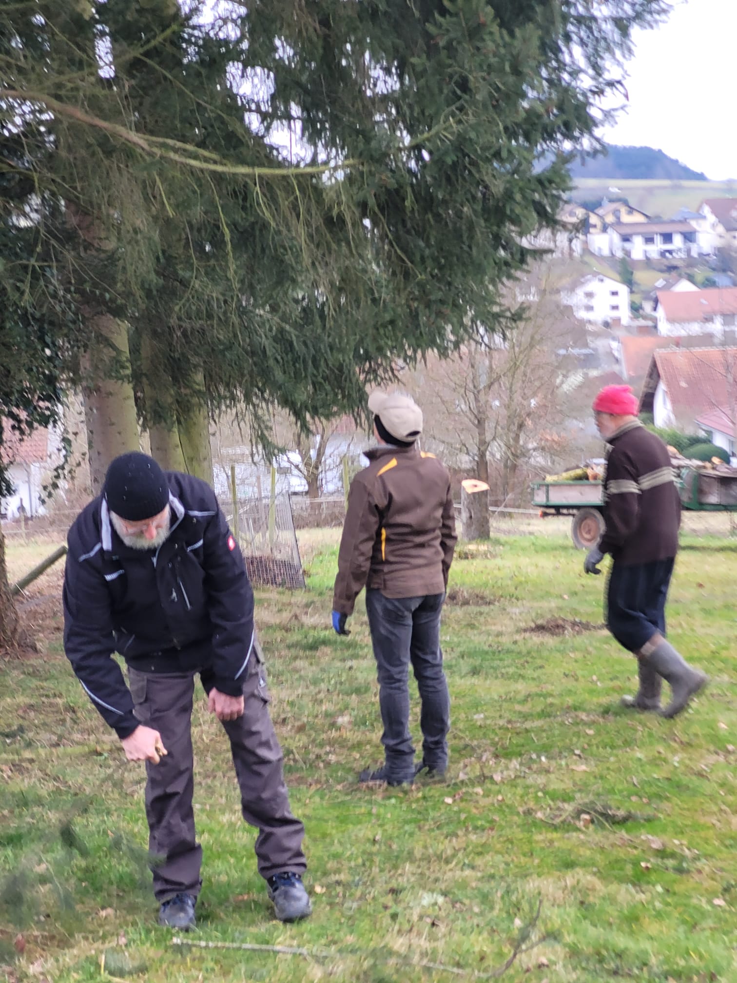 Am Samstag, 15.Februar morgens um 9.00 Uhr haben sich, bei frischen 2°C, 16 Personen auf dem Vereinsgelände eingefunden um das Grundstück auf den nahenden Frühling vorzubereiten. Ausgerüstet mit Schere, Harke, Rechen und Sägen ging es vereint zu Werke. Vier abgestorbene Altbäume wurden gefällt, damit im Herbst Platz für die Neupflanzungen geboten ist. Sie wurden mit ca. 1 m Stumpf gelassen um damit Insektenhotels zu bauen. Auch wurden rund um das Grundstück die Dornen entfert um dem Zaun wieder Raum zu verschaffen. Dieser wird in einer der nächsten Arbeitseinsätze erneuert um die Neupflanzungen vor Wildverbiss zu schützen. Die junge Generation hatte viel Freude am großen Feuerhaufen, der bei den morgendlichen Temperaturen für wohlige Wärme sorgte. – Nach getaner Arbeit gab es eine deftige Stärkung, die Inge Leupolz wie gewohnt mit Herzblut präsentierte. So fanden dann im Anschluss bei den vielen Leckereien noch viele interessante Gespräche statt und die tollen Ideen daraus werden bei den nächsten Treffen gerne umgesetzt.