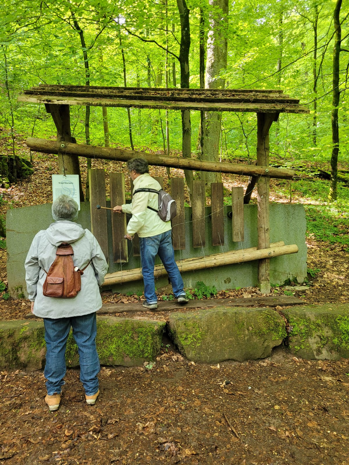 Mit 25 Teilnehmern ging es am Sonntag, den 4. Mai nach Hammelbach auf den Klangweg. Unser Wanderwart, Hermann Rettig, hatte diese abwechslungsreiche und interessante Route ausfindig gemacht. Bei idealem Wanderwetter traf man sich, nach Bildung von Fahrgemeinschaften, in Hammelbach, um von Hermann gleich zu Beginn in die Geschichte rund um die Kirche und Friedhof entführt zu werden. Kurz darauf begab sich die Gruppe auf den eigentlichen Klangweg. Dieser führt über die Weschnitzquelle bis zum Eselstein und über Altlechtern und der Schanze zurück nach Hammelbach. Ausgiebig wurden die verschiedensten Klanginstrumente wie z.B. Windharfe, Waldmarimba oder Summstein ausprobiert und so manches musikalisches Talent wurde entdeckt. Nach ca. 8 km und 2,5 Std traf man in der Hofschenke Bauer ein wo sich alle nach eigenem Gusto stärken konnten. Ein herrlicher und gelungener Wandertag neigt sich dem Ende und da bleibt nur noch unserem Wanderwart, Hermann Rettig, für diese schöne Route dank zu sagen.