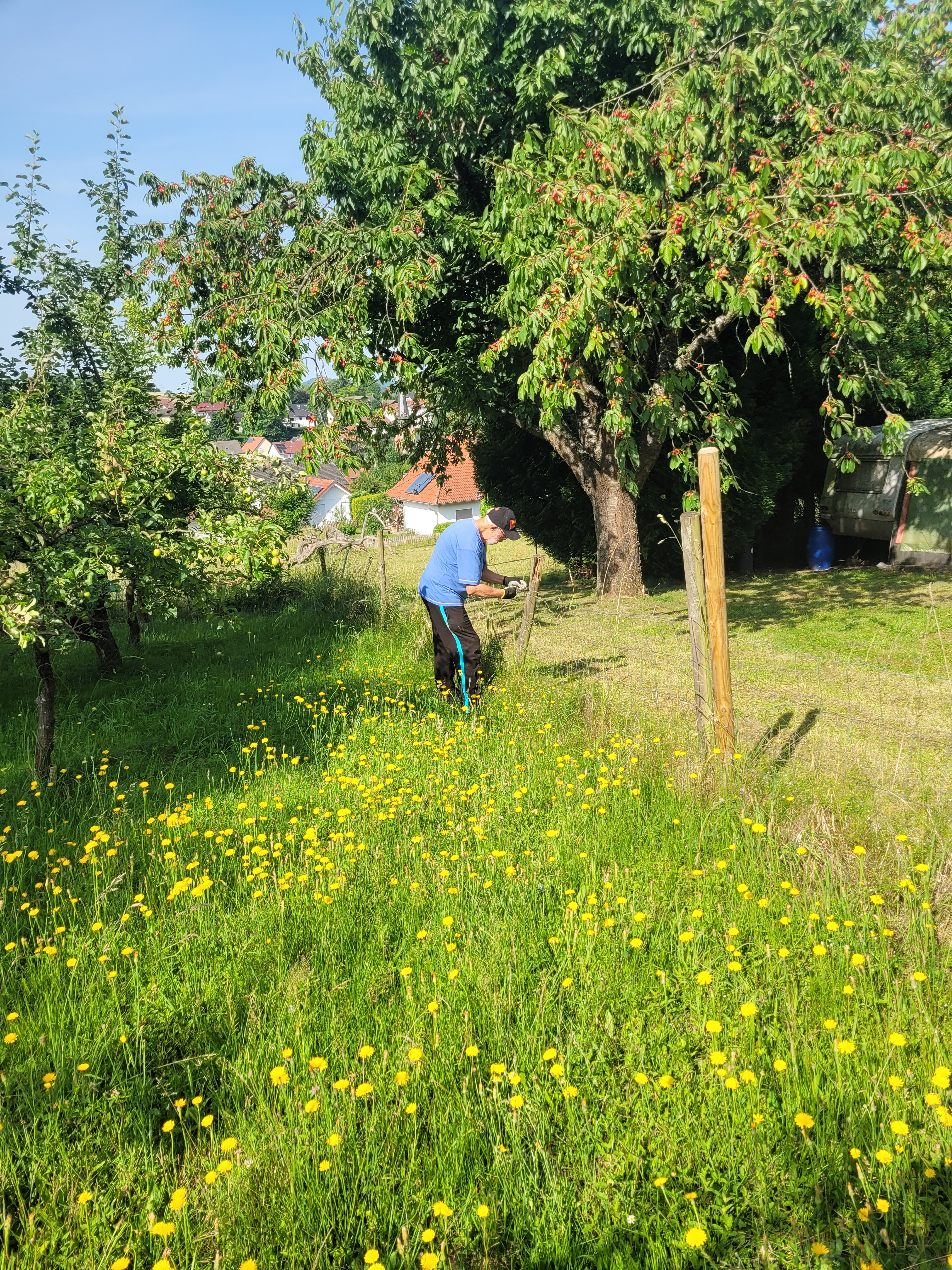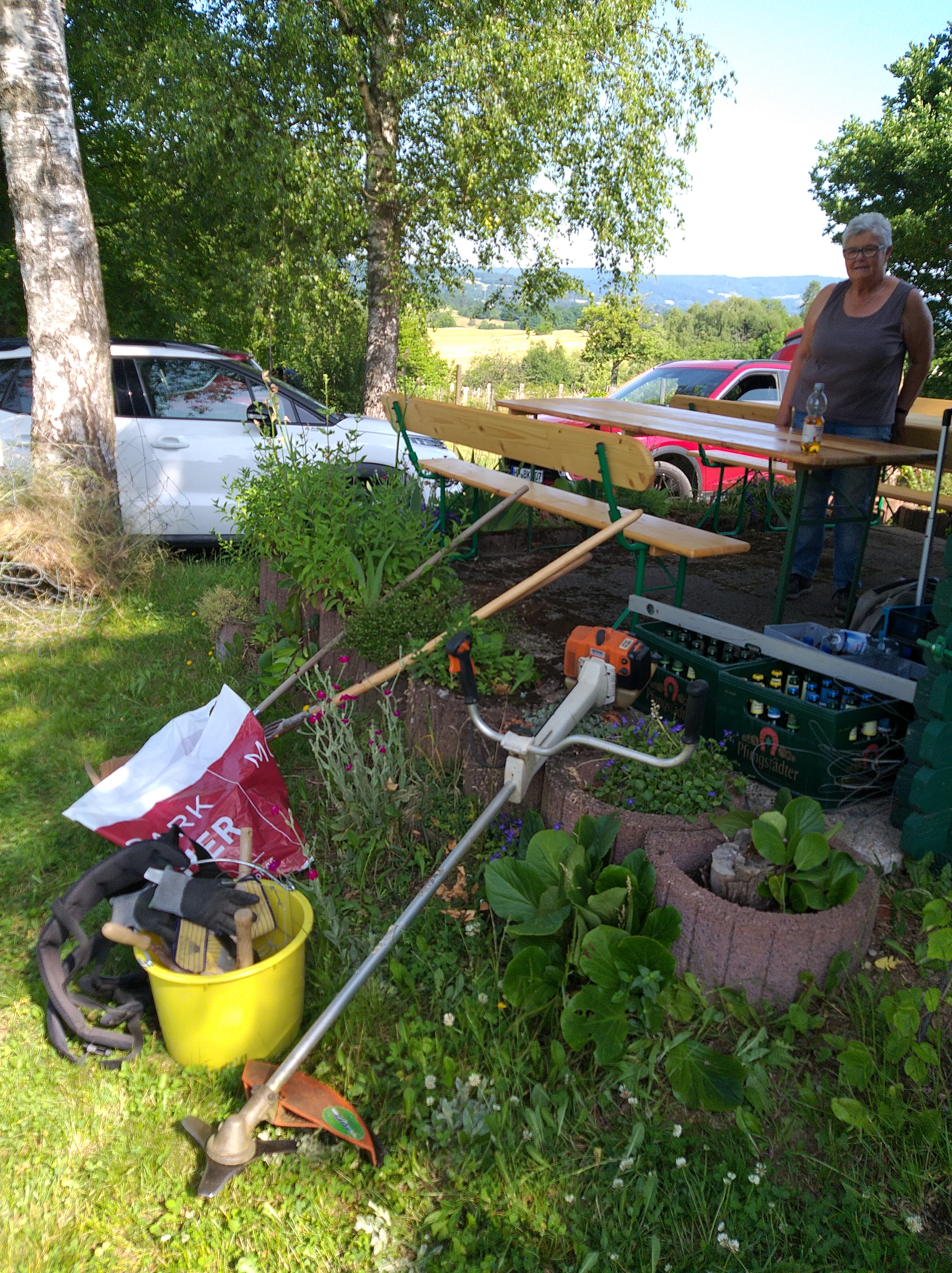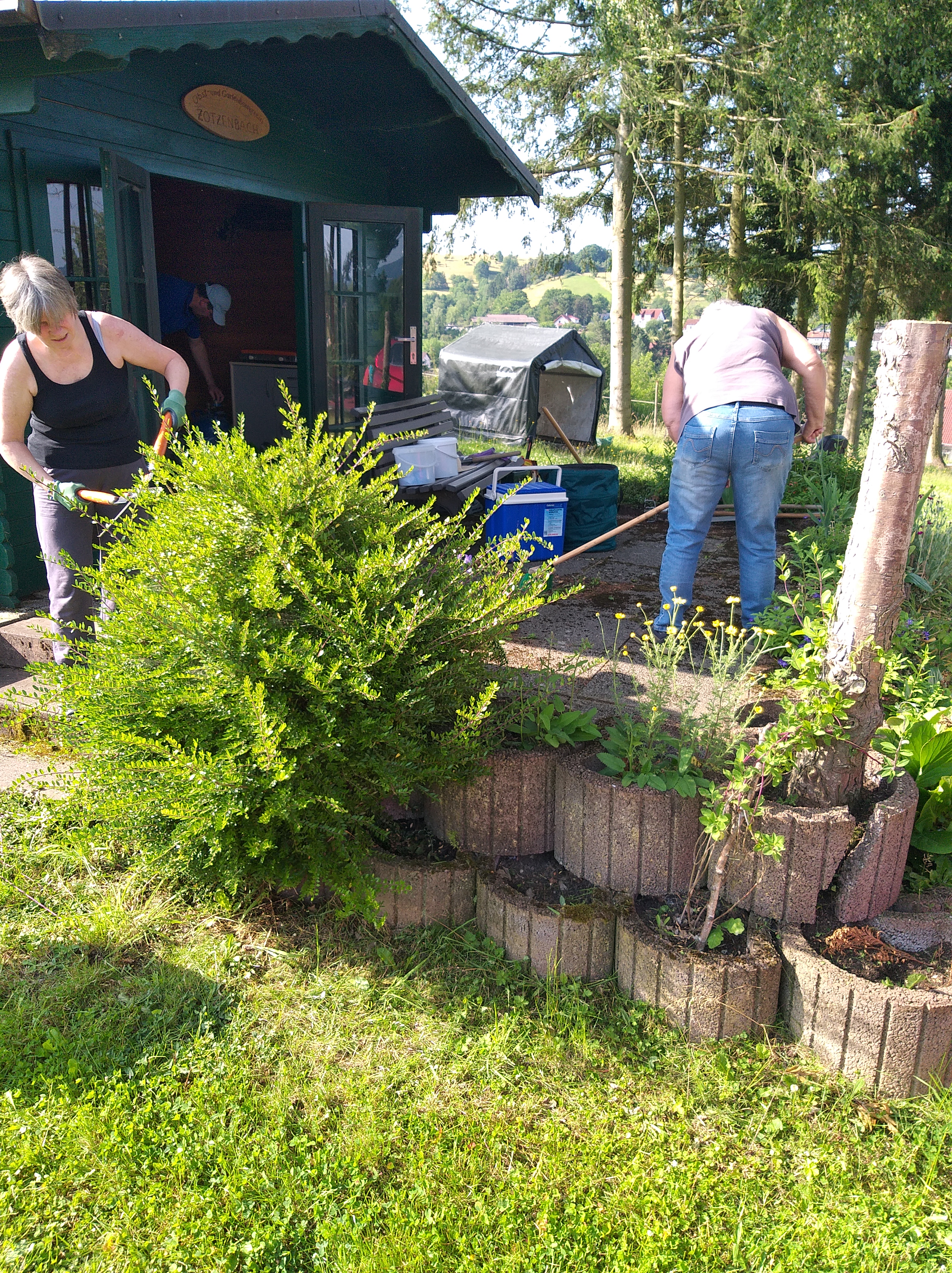 Den wärmsten Tag im Juni nahmen wir unbewusst zum Anlass wiedereinmal Ordnung auf unserem Vereinsgelände zu schaffen. 12 Vereinsmitglieder haben die morgentliche Kühle genutzt und den alten Zaun entfert, Gartenhütte und Vorplatz neu gestaltet und die abgeblühte Wiese gemäht. Da allen die Arbeit gut von der Hand lief konnten wir uns schon um 11:oo anstatt der geplanten 12:oo Uhr zum gemütlichen Teil begeben. Inge und Roland Klein haben aus gegebenem Anlass für das leibliche Wohl gesorgt und die Truppe mit Rinds- und Fleischwürstchen, Käsebrötchen und kühlen Getränken versorgt. – Den Beiden sei herzlich gedankt. – Beim nächsten Einsatz soll nun der neue Zaun installiert werden. – Bleibt zu hoffen, dass sich wieder so viele Helfer einfinden, nach dem Motto: „Viele Hände schaffen bald ein Ende“.